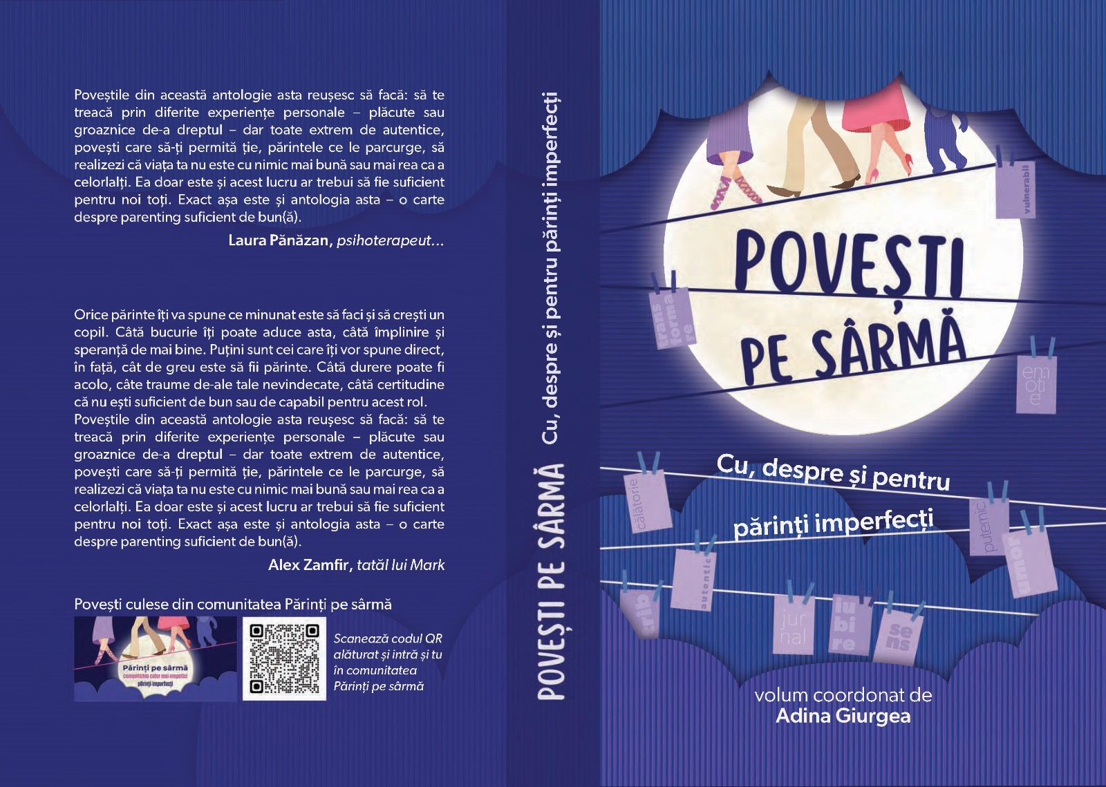 Povești pe sârmă. Cu, despre și pentru părinți imperfecți” este prima carte cu povești culese dintr-o comunitate de părinți din România. Fie că te pregătești să devii părinte, ai un bebeluș sau un toddler acasă sau chiar un adolescent, cele peste 50 de povești din acest volum colectiv te vor inspira, te vor face să râzi, să plângi, să te bucuri, să simți că nu ești singur. Să te simți văzut. Auzit. Înțeles. Poveștile, împletite cu porțiuni de umor, pagini de jurnal și ilustrații sugestive, oglindesc experiențe diverse precum temeri, furie, neputință, bucurie, relaxare, învățare, singurătate, ajutor, vulnerabilite, râs. Toate aceste emoții răzbat din experiențe de viață legate de naștere, pierdere, creștere și transformare.